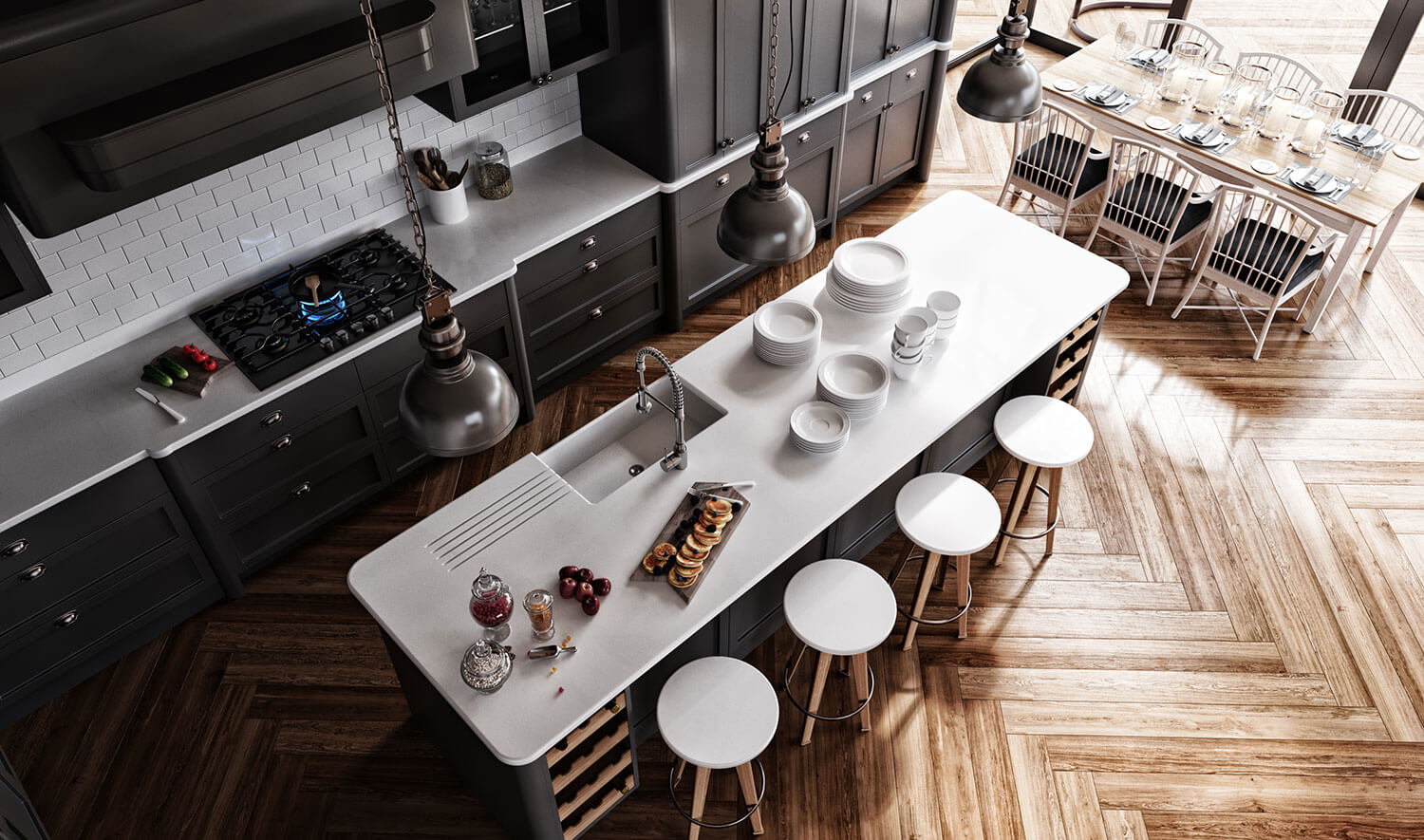 The Classic Combination of Grey The classic combination of grey and white colors merged into a single ensemble of the kitchen. A family will gather behind this kitchen island for breakfast. Project navigationPreviousPrevious project:Studio Apartment Living RoomNextNext project:High Quality Hardwoods